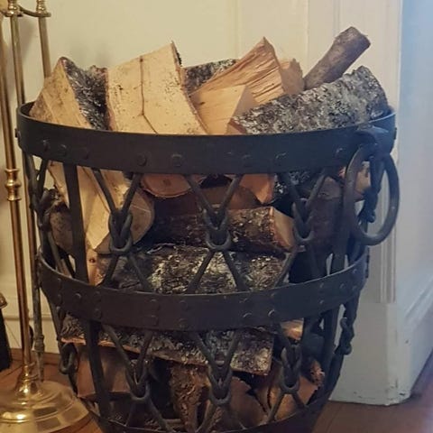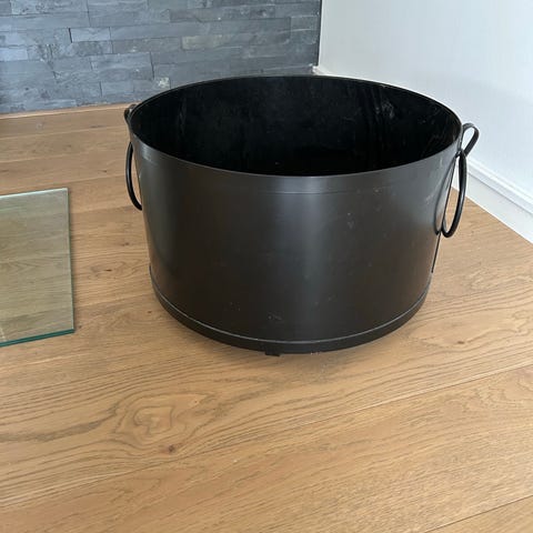 Vedkorg i svart metall.