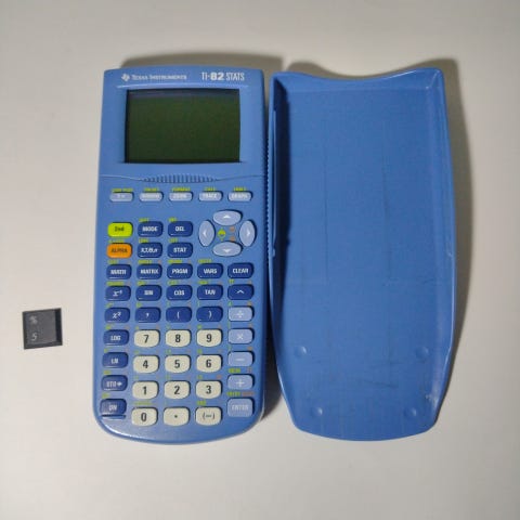 Texas Instruments TI-82 grafräknare i svart utförande. Modellen har stort displayfönster och ett fullstort tangentbord med funktionsknappar för bland annat grafer, statistik, trigonometriska funktioner och minneshantering. Passar för matematik- och naturvetenskapsberäkningar på grundskole- och gymnasienivå. Drivs med batterier (ej specificerat på bilderna).