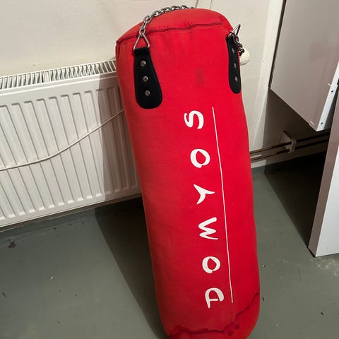 Boxningssäck från Domyos. Svart med silver och röda detaljer. Står på en stabil fot som fylls med t.ex vatten.
