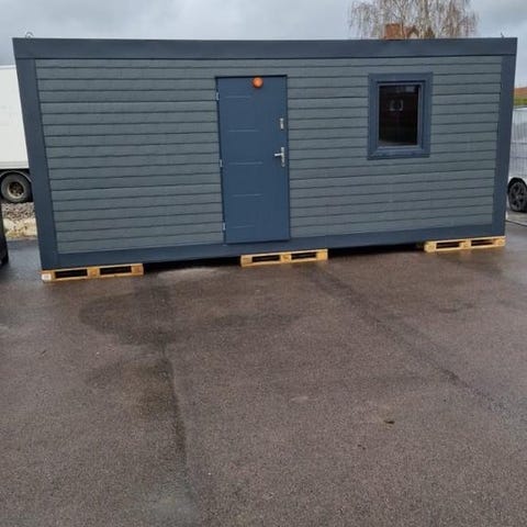 Modulbyggnad kontorsbod med 2 rum och enklare köksdel. Utsida med träpanel med vissa skador i underkant och entrédörr på långsidan. Invändigt finns korridor som leder till separata rum, bland annat ett rum inrett med hyllor och samt ett rum med köksdel utrustad med diskbänk, spis, förvaring och arbetsyta. Byggnaden är avsedd som tillfällig lokal, exempelvis kontor, personalutrymme eller förråd. Elbelysning och fönster för dagsljus finns i rummen.