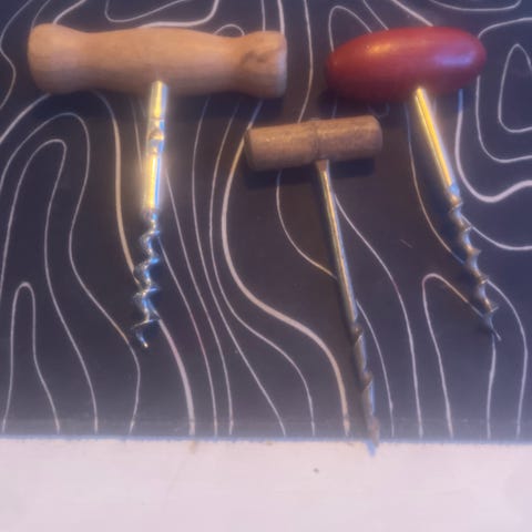 Set med tre flasköppnare i metall med olika handtag. Två flasköppnare har handtag i trä med olika form och ytbehandling, varav en med hål för upphängning. Den tredje flasköppnaren har ett avlångt handtag i gul plast. Alla tre är avsedda för öppning av kapsyler på flaskor och passar för användning i kök, bar eller vid servering.