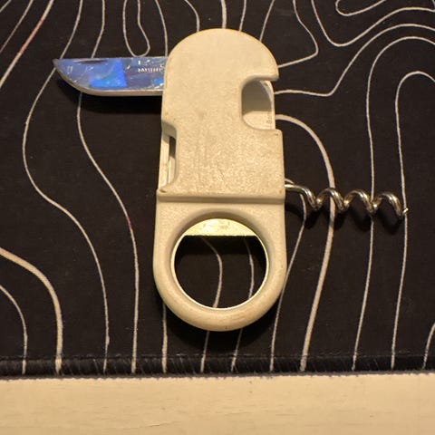 Vinöppnare med korkskruv i metall med rött handtag. Verktyget har utfällbar korkskruv, flasköppnare och en liten kniv. Passar för öppning av vinflaskor med kork samt kapsylerade flaskor.