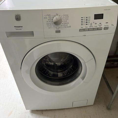 Cylinda frontmatad tvättmaskin i vit färg. Maskinen har en frontlucka med glasfönster och kontrollpanel placerad ovanför luckan. Avsedd för hushållstvätt av kläder, handdukar och andra textilier. Ansluts till el, vatten och avlopp enligt tillverkarens anvisningar.
