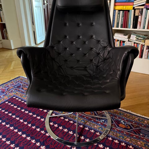 Klassisk Bruno Mathsson fåtölj i svart läder med fin patina. Sömmar som gått upp i sitsen som är tillfälligt lagade och funkar bra. Orginalutförande, inköpt på Bukowskis för ca 11 år sedan.