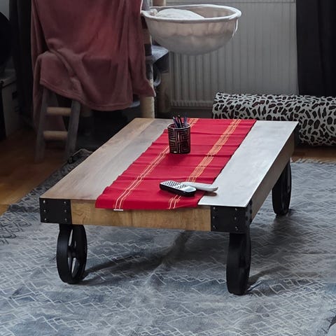 Ett rustikt soffbord i fint skick säljes. Bordet är brunbetsat, har dekorativa smidesdetaljer och är mycket välvårdat och stabilt.