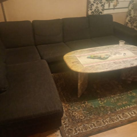 Stor u divan . Hund har i hemmet. Har filtar nu på soffan för att skydda tyget pga hund. Går att tvätta allt överdrag till den i maskin . Blir som ny då. Bekväm stor . Priset är inte hugget i sten. Soffan är hel.