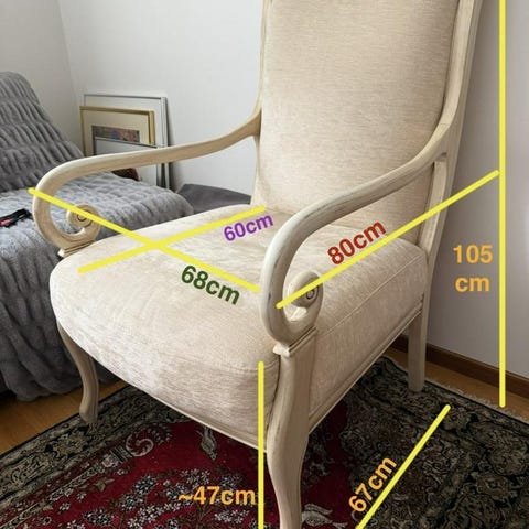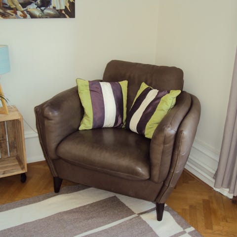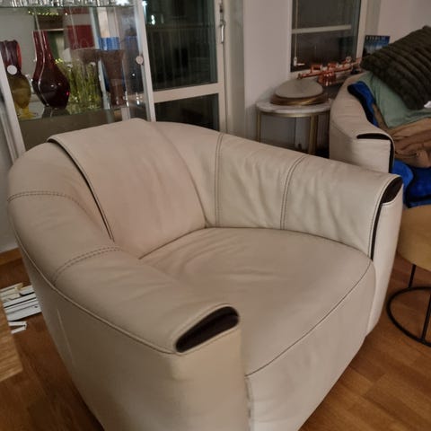 Material: Fåtöljen har en innerstruktur av trä med stoppning av polyuretanskum i olika densiteter.