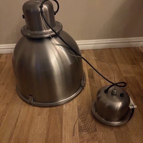Pendellampa i industristil (industriell taklampa) med en kupa i borstad metall, aluminium. Denna typ av belysning kännetecknas av sin robusta, utilitaristiska design med synliga detaljer som metallkedjan den hänger i.