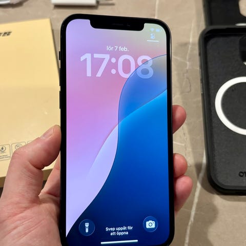 Apple iPhone 12 smartphone med 128 GB intern lagring. Modellen har svart färg och dubbla kameror på baksidan samt skärm som täcker nästan hela framsidan. Lämplig för vardaglig användning som samtal, meddelanden, surf, appar, foto och video. Levereras med originalkartong enligt bild om inget annat anges av säljaren.