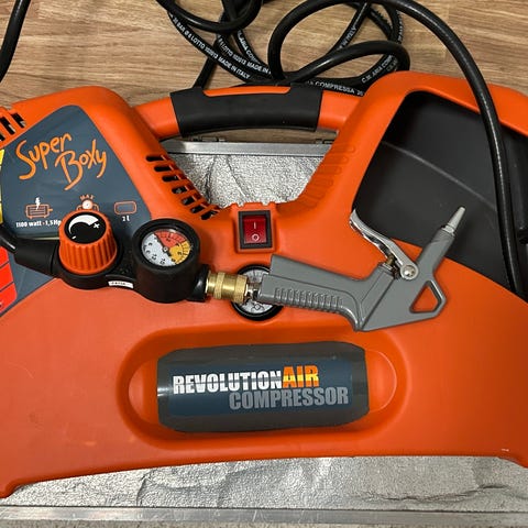 Medföljer diverse tillbehör samt Slangupprullare för tryckluft som monteras på vägg.