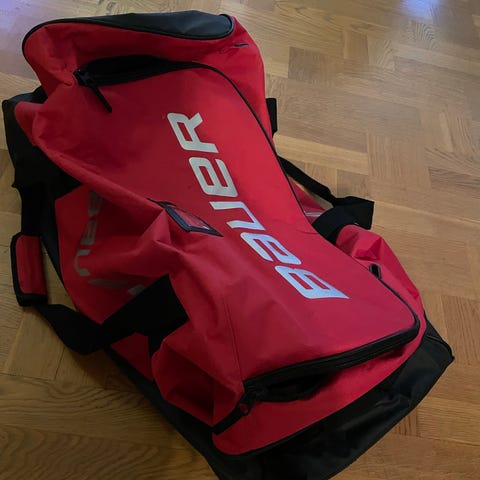 Ccm hockeybag med hjul i mycket bra skick. Längd 95cm, bred 45cm och höjd 45 cm. Ingen skador och ganska ren och luktfri.