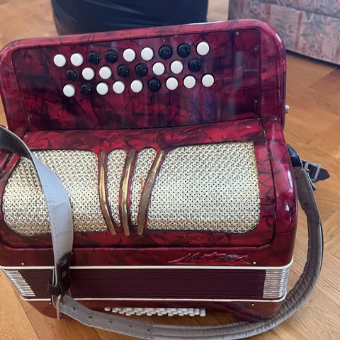 Litet knappdragspel av märket Curtini. Tvåkörigt oktavstämt med 34 knappar i diskanten och 60 basknappar. Tätt och bra i bälgen. Vikt 6kg.