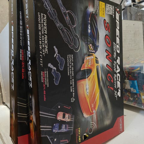 Elektisk bilbana med två bilar som styrs med kontroller.