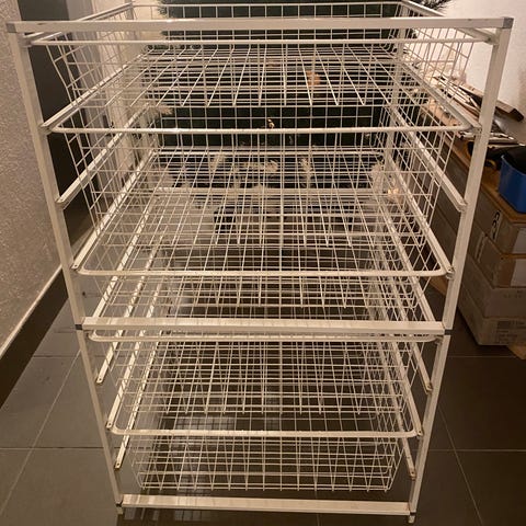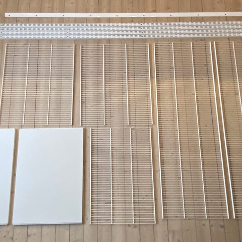 Garderobssystem från Elfa. Inköpt på XL-bygg. Allt på bilden ingår. Systemet är 2m brett. Lådorna är 40 cm djupa och 60 cm breda.