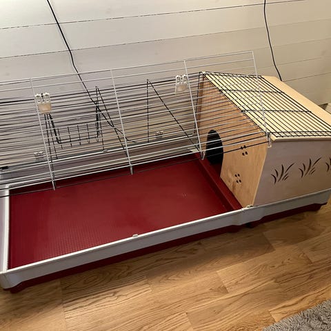 Fin bur för utomhusbruk. 2 plan med öppning mellan. Bodel för kaninungar. Rävsäker och vattentät, både papp och plast på taket. Mått 59x155cm, 2 våningar