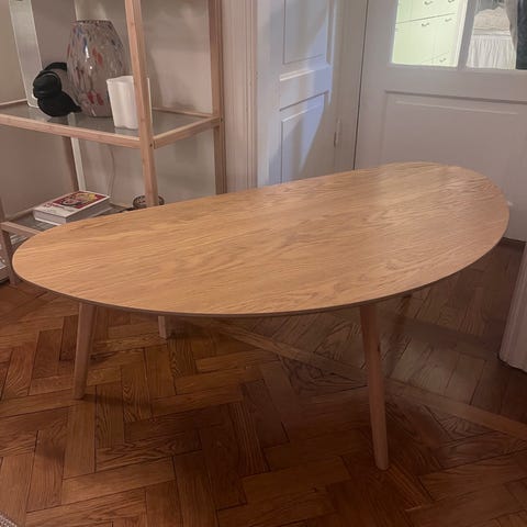 Ommålat i en ljusrosa färg. Något sprucken i träet på ena sidan (se bild)