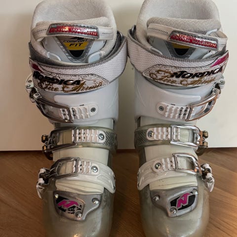Nordica Olympia One X pjäxor i vit och silver färg. Modellen har fyra justerbara spännen i metall och ett högt skaft med vadderad innersko för stöd och komfort. Pjäxorna är avsedda för alpin skidåkning och passar för användning i skidbacke med vanliga alpina bindningar.