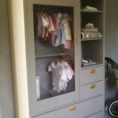 Äldre välvårdat skåp/garderob i fin grå/blå nyans. Hyllplan invändigt samt en utdragbar låda.