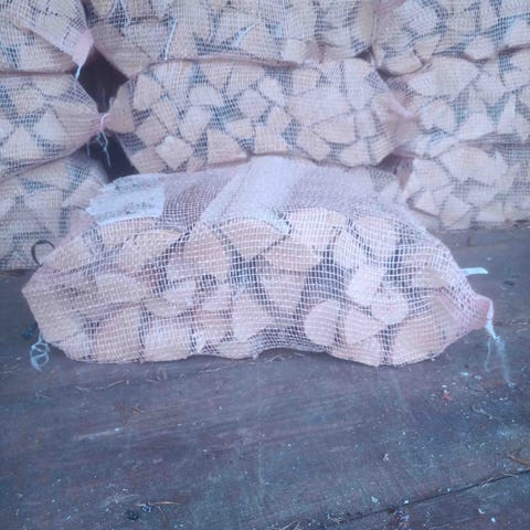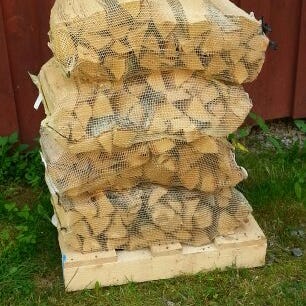 Ved i nätsäck. Vedträna är kapade på 30 cm och kluvna och förpackade i nätsäckar för enkel hantering, transport och förvaring.