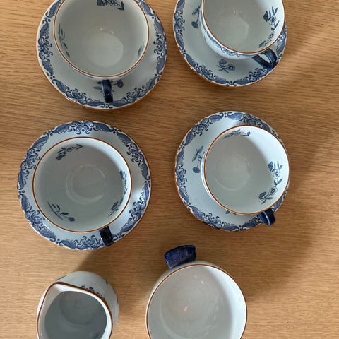 6 kaffekoppar, 6 kaffefat, 6 assietter( varav en med mindre nagg, knappt synlig, se bild) och en mjölkanna.