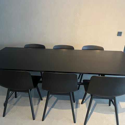 Vi säljer ett svart Loop stand bord från märket Hay. Bordsskivan är i svart linoleum och benen är i metall.