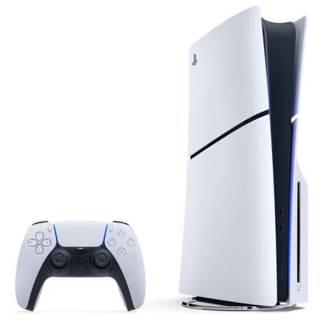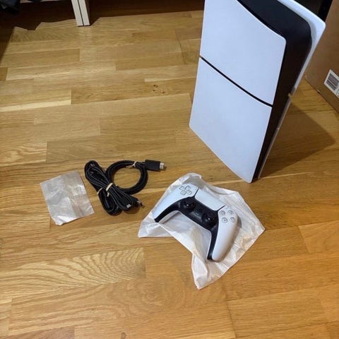 Sony Playstation 5 spelkonsol i vit färg med tillhörande DualSense trådlös handkontroll. Konsolen är avsedd för spel, film och streaming och ansluts till tv eller skärm via HDMI. DualSense‑handkontrollen har inbyggd touchpad, högtalare och rörelsesensor samt ansluts trådlöst till konsolen. Systemet stödjer spel och media anpassade för Playstation 5‑plattformen.