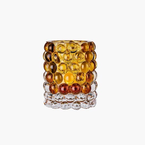 Cube ljuslykta i glas i brun ton. Ljuslyktan har en kraftig, strukturerad glasdesign med klar glasbotten och brunfärgad överdel.