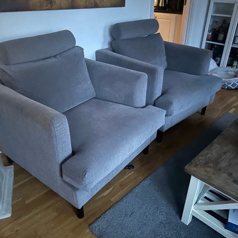 Skön 3-sitssoffa samt en härligt bred fåtölj. Benhöjd 15 cm så det är lätt att komma under med dammsugaren.