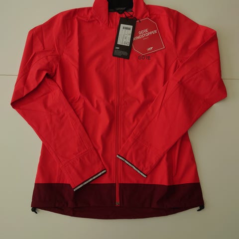 En vinröd skaljacka med huva och dragkedja framtill. Jackan har fickor med dragkedja och justerbara ärmslut med kardborreband. Insidan är fodrad med mesh. Använd, men i gott skick.