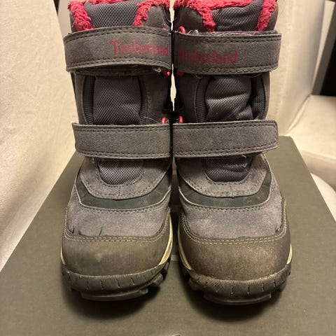 Timberland vinterstövlar för barn, modell för flicka i storlek 32. Stövlarna är i grått med rosa detaljer och har hög modell med varmt foder. Ovandel i textil och syntet med kardborreband framtill för enkel av- och påtagning. Grovmönstrad sula anpassad för vinterbruk. Passar som vinter- och höstskor för barn. Man kan hämta dem i Spånga eller i Vasastan.