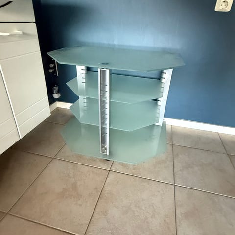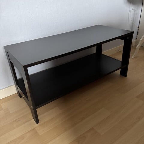 Ikea tv-bänk med förvaring i svart utförande. Möbeln har tre öppna fack upptill som kan användas för tv-box, spelkonsol eller annan elektronik. Nedtill finns tre utdragslådor med front i kontrasterande färg/glas för dold förvaring av tillbehör som kablar, spel eller media. Lämplig som låg mediabänk i vardagsrum eller tv-rum.