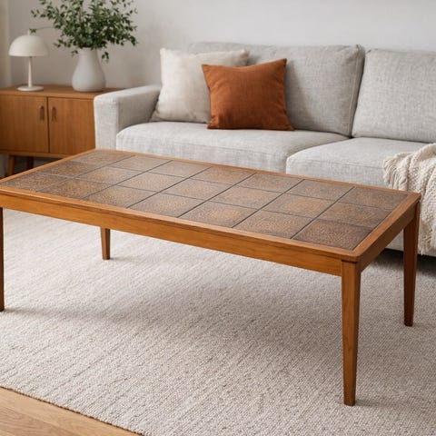 Stabilt och gediget kakelbord- i varm träton, sannolikt teak( ej säker). Kakelyta i jordnära grönt och rött-typiskt 60/70- talsdesign.