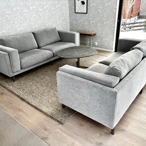 Två moderna soffor med stålben