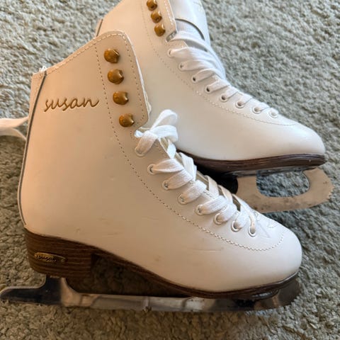 Alina ISE konståkningsskridskor i storlek 40. Skridskorna är vita med snörning och guld färgade öljetter samt texten "Safine" på sidan. Klassisk modell med hög skaft för stöd, passar för allmän åkning på is.