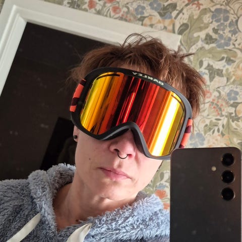 Glasögonen har tonat glas och justerbart elastiskt band. Avsedda för skidåkning eller snowboardåkning och kan användas tillsammans med hjälm. - 300kr