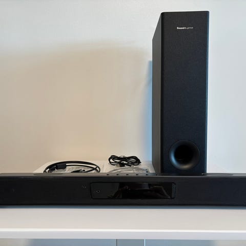Soundbaren har touchknappar för ström, volym och källa samt display på framsidan. Enheten stödjer Dolby Digital och DTS och har HDMI-anslutning. Till systemet hör en subwoofer.