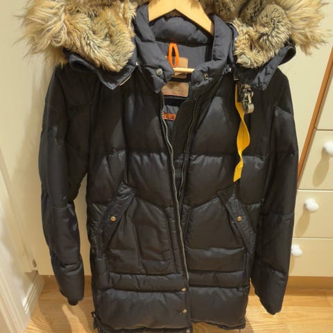 Parajumpers jacka för dam i storlek S. Jackan är marinblå och fylld med dun. Modellen har huva med äkta päls, flera ytterfickor med dragkedja och knappar samt justerbar midja. Obetydligt använd och i fint skick.