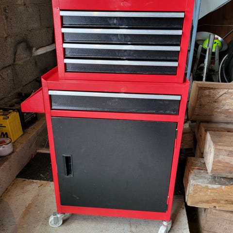 I lådorna finns skuminlägg med sorterade verktyg, bland annat hylsor i olika storlekar, spärrskaft, förlängare, bits, fasta och ringnycklar, skruvmejslar, skiftnyckel, insexnycklar, tång, kniv, såg, hammare och måttband. Verktygen är placerade i formskurna inlägg för översiktlig förvaring och snabb åtkomst.