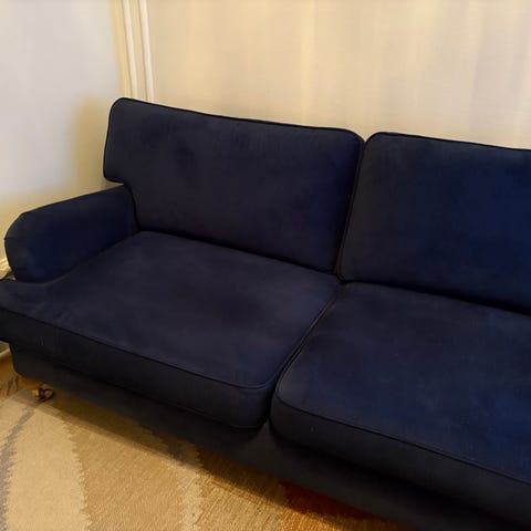 Soffgrupp från Mio i bra skick. Finns lite färgavlagringar på benen men i övrigt bra skick. Soffan går att dela i två delar. Det är en rak tresitssoffa i en mörkgrå, sammetsliknande textil. Modellen är låg och djup med generöst sittdjup. Det finns nitar längst med utsidan och armstöden som dekor. Samma stil för fåtölj samt sittpuff. Säljes som en grupp.
