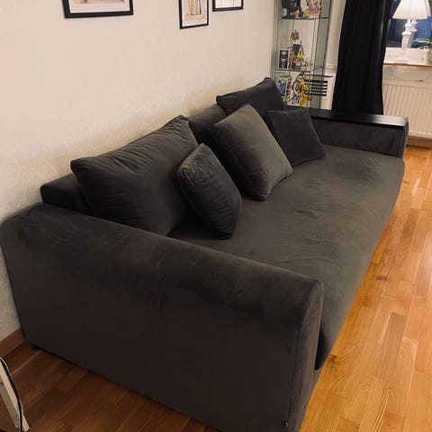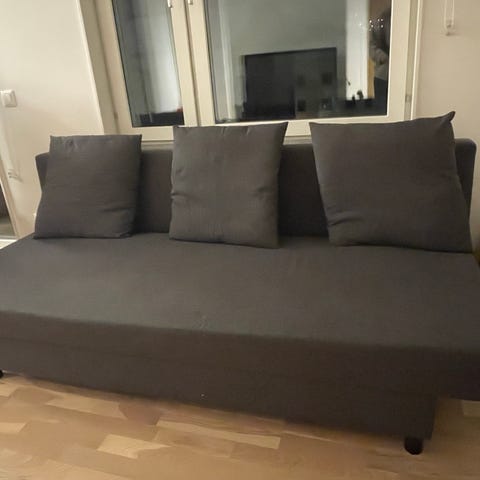 Bortskänkes en bekväm bäddsoffa med förvaring under. Den är tung och det krävs 2 personer för att lyfta den.
