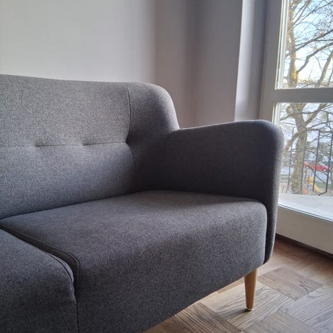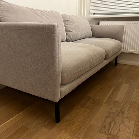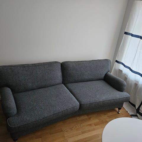 2,5 sits, Grafitgrå. Ingen märkning men Jysk/Ikea är typmodellen. Bra stabil konstruktion så även Mio kan vara ursprunget.