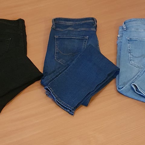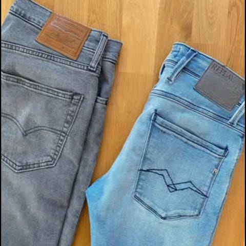Det ena paret har slitna detaljer på knäna, medan det andra paret är utan slitningar.