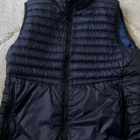 Bläck väst för herr i storlek 48. Väst i grått småmönstrat tyg, tillverkad i polyester med slät fodrad insida. Modellen har knappknäppning framtill och två passpoalfickor. visar en reva vid en söm som kan behöva lagas. Lämplig att bära till kostym eller skjorta vid mer uppklädda tillfällen.