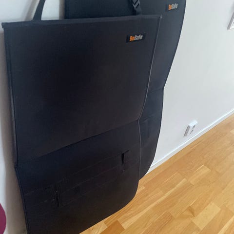 Universellt bilstolsskydd i svart färg. Skyddet täcker både sits och ryggstöd och har utfällbara sidoflappar för extra täckyta. Det är avsett att placeras på bilsätet för att skydda klädseln mot smuts och slitage, till exempel under bilbarnstol eller vid vardagligt bruk. Materialet är lätt att torka av och hålla rent.