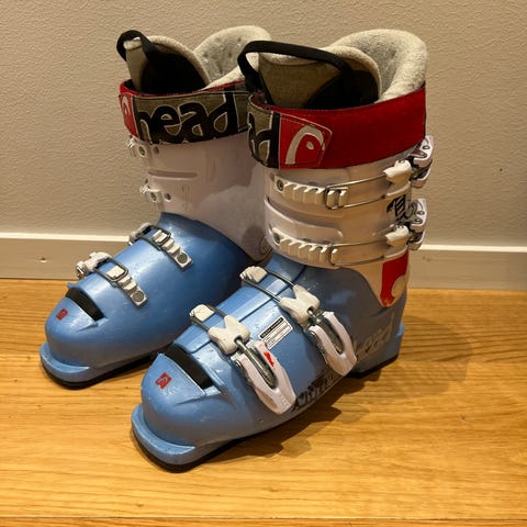 Head pjäxor i storlek 24.0–24.5 (mondopoint) i blått och vitt. Sulmått cirka 289 mm enligt märkning på skalet. Modellen har fyra spännen framtill samt justerbart spänne upptill för att kunna anpassa passformen runt fot och vad. Passar för alpin skidåkning. Designade i Italien med hårt yttre skal och vadderad innersko för stöd och stabilitet.