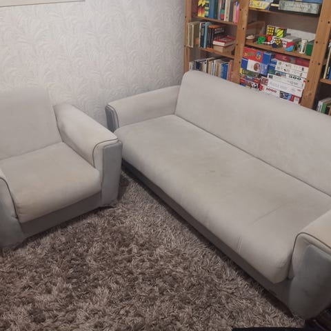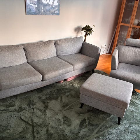 Mio soffgrupp med tillhörande fotpall i grått tyg. Soffan har raka armstöd och två sittkuddar med två ryggkuddar. Fotpallen är rektangulär med samma klädsel och ben som soffan. Passar som sittgrupp i vardagsrum eller tv-rum. Ben i metall ger ett lätt uttryck och underlättar städning under möblerna. Lite använd. Säljes helst som grupp.