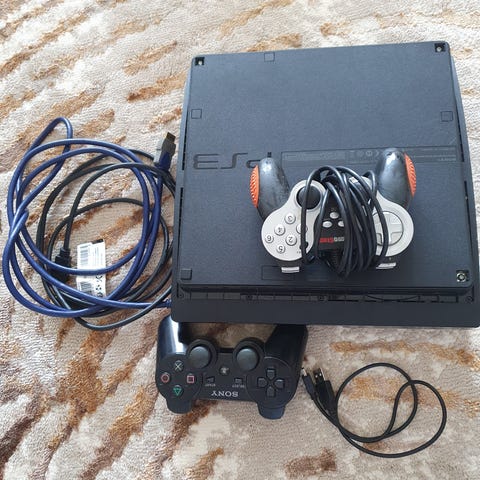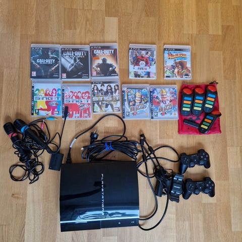 Sony Playstation 3 spelkonsol i svart utförande. Konsolen är av den äldre, blanka modellen. På bilderna syns medföljande handkontroll (DualShock 3) samt strömkabel. Konsolen har inbyggd Blu-ray-spelare och stöd för trådlöst nätverk (WiFi), nätverkskabel, USB-anslutningar och HDMI-/AV-utgångar. Lämplig för Playstation 3-spel, Blu-ray-filmer, dvd-filmer och uppspelning av digitalt media via lagringsenheter eller nätverk. Har provspelat Battlefield 3 i 30min utan konstigheter.