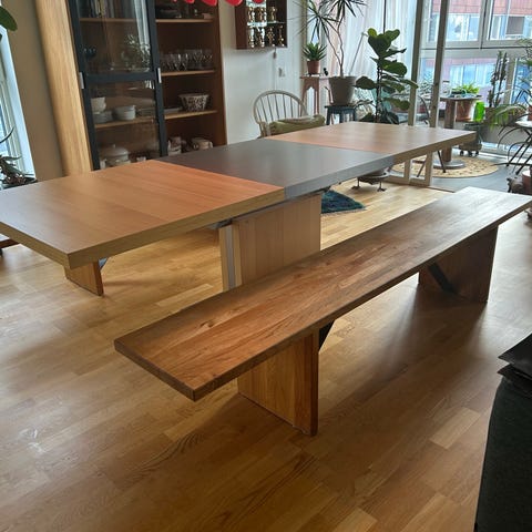 Säljer en unik och pampig matgrupp från svenska No Early Birds (NEB), formgiven av arkitekten Per Söderberg. Gruppen består av ett rejält matbord i specialmått och två tillhörande bänkar.