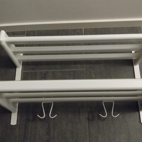 Skohylla och hatthylla i vitt trä med smidesdetaljer