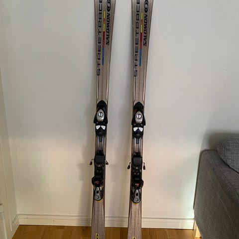 Salomon slalomskidor med bindningar i röd färg. Använda av dam som är ca 155cm och väger ca 50kg. Skidorna är utrustade med integrerade alpina bindningar som kan justeras efter pjäxstorlek. Passar för utförsåkning i preparerade backar. Konstruktionen är anpassad för stabilitet och kantgrepp vid svängar. Lämpliga för åkare som söker ett par kompletta skidor med monterade bindningar.